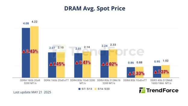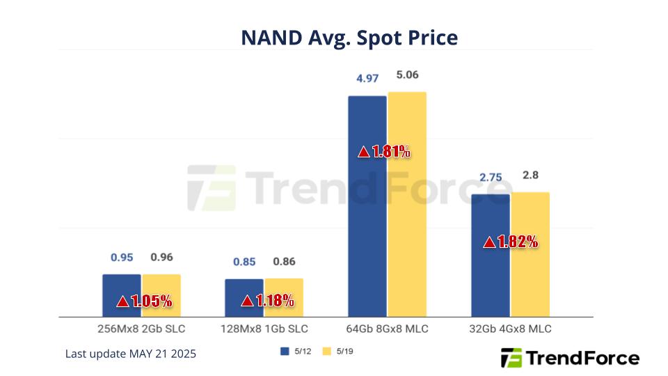 Similar to the situation in the contract market, the spot market shows prices of DDR4 products registering larger hikes compared with prices of DDR5 products due to the anticipation of supply tightening in the future. Prices of DDR5 products also continue to rise incrementally because module houses are eager to build up their inventories. TrendForce believes that overall, spot prices will remain on an upward trend throughout 2Q25, and the gap between prices of DDR4 and DDR5 products will shrink further. Currently, the price premium that DDR5 commands over DDR4 for 2Gx8 chips comes to around 29%. As for the mainstream chips (i.e., DDR4 1Gx8 3200MT/s), their average spot price has risen by 1.55% from US$2.129 last week to US$2.162 this week.