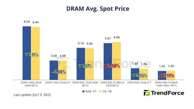 In the spot market, the majority of transaction volumes are still related to DDR4 products. While spot prices have experienced intermittent rises, this mainly reflects a correction of previously excessive increases, rather than an indication of oversupply. Apart from DDR4, there are no significant price increases for other product categories. On the whole, the DRAM market may observe a gradual weakening of prices in 3Q25 due to loosening market conditions. Regarding mainstream chips (i.e., DDR4 1Gx8 3200MT/s), their average spot price has decreased by 1.09% from US$5.058 last week to US$5.003 this week.