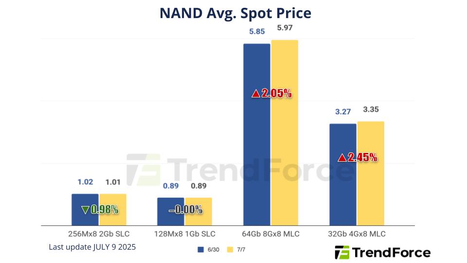 The spot market has been sluggish in recent transactions mainly due to the higher level of current spot prices, as well as the diminishing effect from China’s national subsidy that supported market dynamics for 1H25, and the conclusion to the 618 shopping festival. These factors brought enervation to the demand for the consumer market, and buyers are starting to observe the subsequent development on US tariffs. Spot prices of 512Gb TLC wafers dropped by 0.15% this week, arriving at US$2.676.