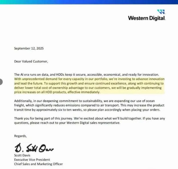 Following SanDisk’s 10% NAND price hike and Micron’s week-long pricing freeze, Western Digital has become the third company to act, notifying customers that it will gradually raise prices on all HDD products effective immediately, according to industry sources.
