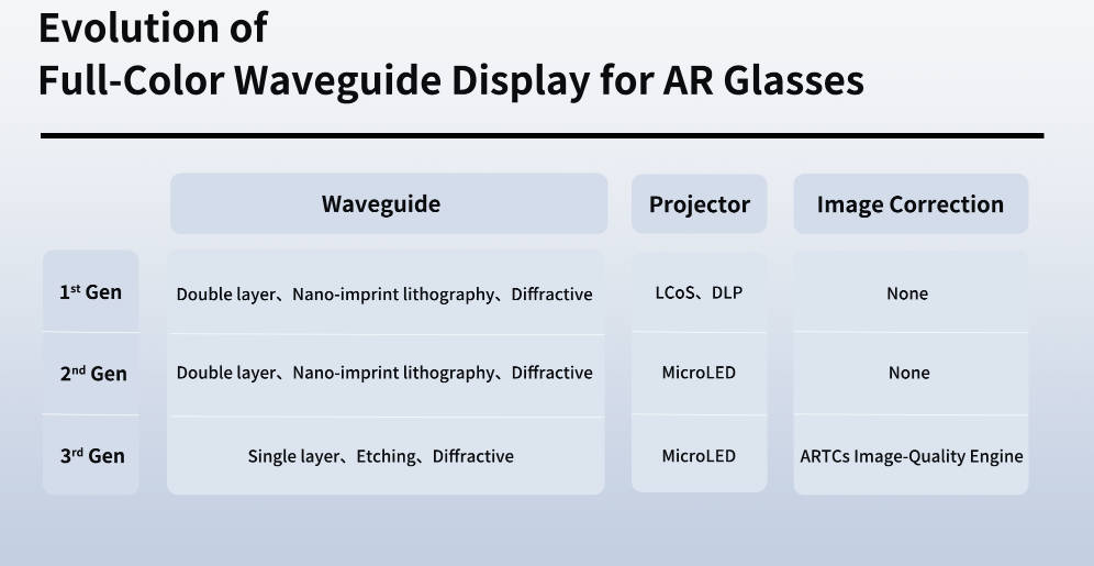 Optics and display architecture are the core determinants of AR visual experience. From early LCoS/DLP + nanoimprint lithography (NIL) multilayer diffractive waveguides, to MicroLED + NIL multilayer diffractive waveguides, and now to MicroLED + etched single-layer diffractive waveguides + system-level image-quality correction, full-color waveguide AR glasses have undergone three generations of technological innovation—achieving concurrent breakthroughs in lightweight design and high image quality.