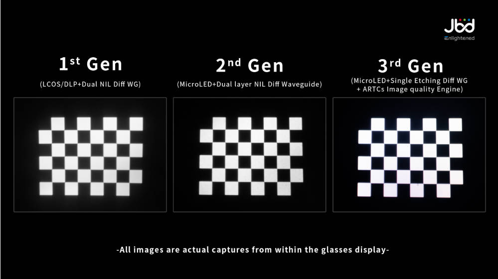 Real-world comparisons show comprehensive improvements in perceptible display quality with the third-generation architecture: skies in landscape scenes appear more true to life, with higher color saturation and greater clarity; portraits render more delicately with more natural skin tones; and black-and-white checkerboard test patterns exhibit crisper contrast and better luminance consistency, with overall frame uniformity markedly optimized. Collectively, these advances indicate that the display performance of full-color waveguide AR glasses has reached the level required for daily, real-world use.