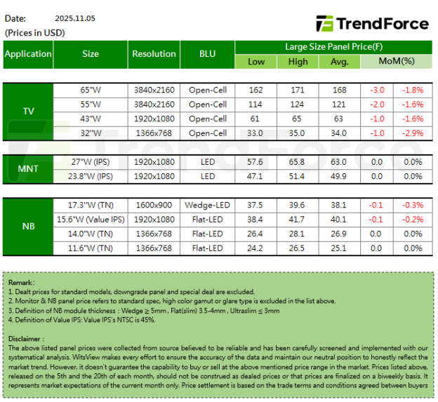 Demand for MNT panels has weakened notably in the fourth quarter. However, panel makers remain reluctant to cut prices, leading to continued losses. As a result, both buyers and sellers largely agree to keep prices stable. For November, prices of most mainstream sizes are expected to remain flat, except for the 23.8-inch VA Open Cell panel, where supply has slightly loosened and prices may drop by US$0.1.
