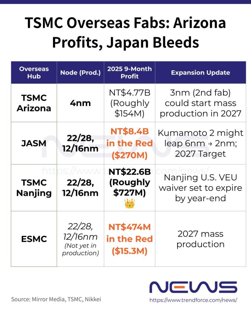 The rationale is clear: TSMC’s financial report shows that in the first three quarters of 2025, after ramping up 4nm production, its Arizona fab posted a net profit of NT$4.7 billion in the first half of 2025. In contrast, JASM reported a NT$6.2 billion loss over the same period.