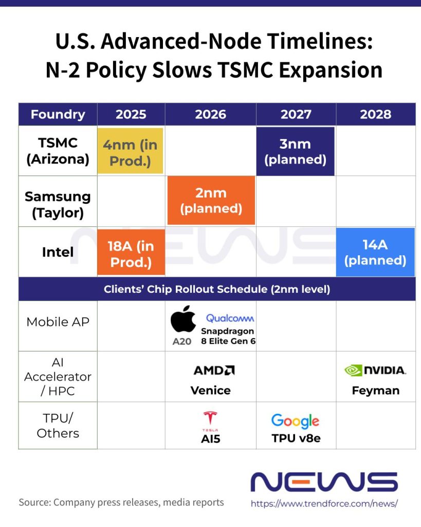According to Sedaily, construction of Samsung’s Taylor fab was 93.6% complete by the end of Q3, with full completion targeted for July 2026. By comparison, TSMC’s first Arizona fab, producing 4nm chips, went online in late 2024, while its second U.S. facility is slated to mass-produce 3nm chips by 2027. As ebn notes, since 2nm currently represents the cutting edge, TSMC’s 3nm output in 2027 is expected to lag by at least two generations under Taiwan’s N-2 principle.