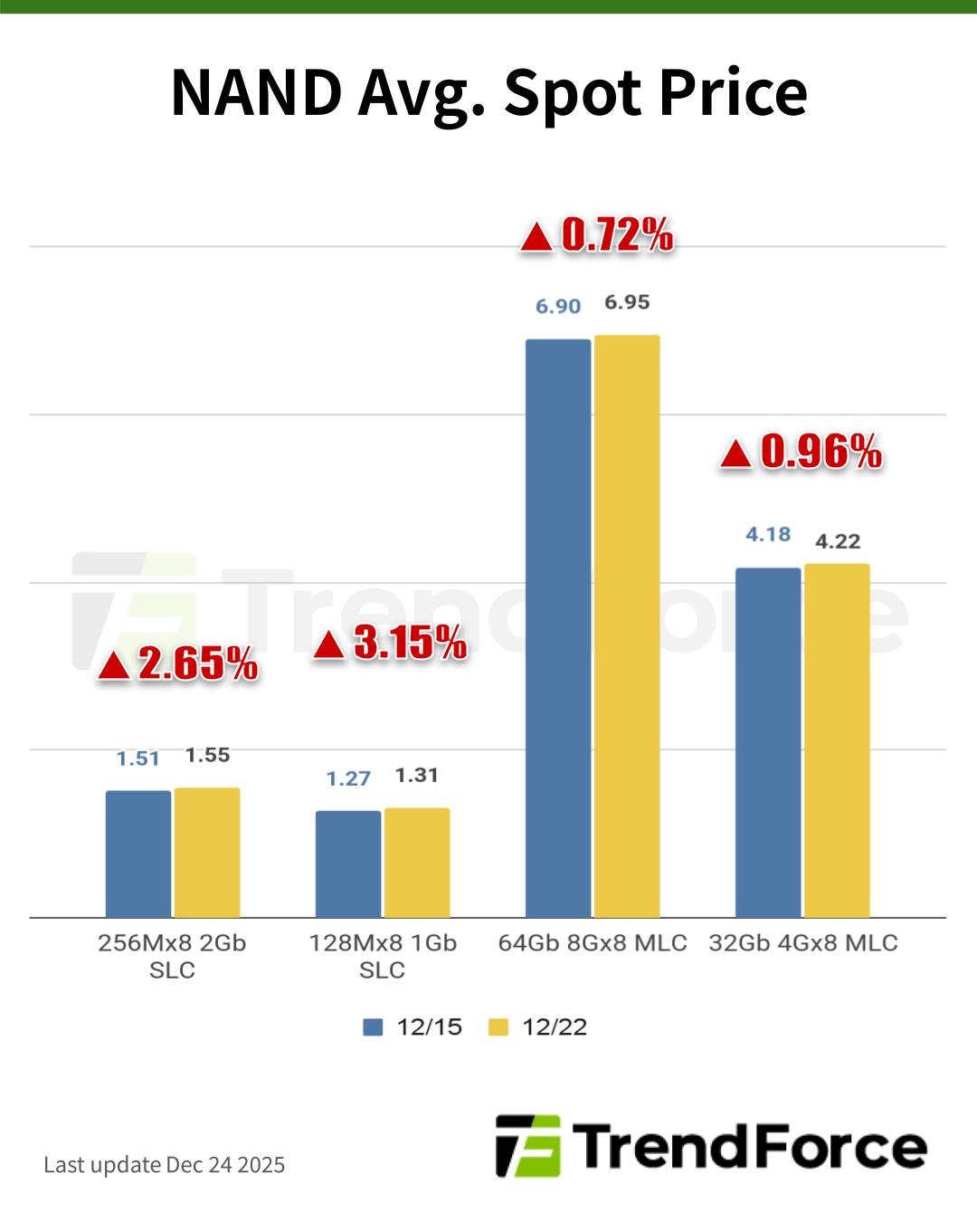According to TrendForce’s latest memory spot price trend report, regarding DRAM, DDR4, DDR5 chips and modules continue climbing daily, though gains have eased slightly. Kingston, the top module supplier, implemented substantial DRAM price hikes this week, with overall spot prices showing no signs of weakness. Meanwhile, in NAND, the spot market is leaning towards a bullish sentiment under the expectation of increasing contract prices. Details are as follows: