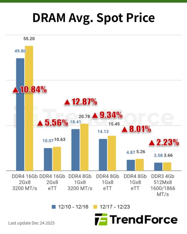 Spot prices of DDR4 chips, DDR5 chips, and modules continue to rise daily, though the rate of increase has subsided somewhat from earlier levels. However, analysis suggests that this is not due to easing supply shortages, but rather a temporary phenomenon as some intermediate traders release more inventory for year-end accounting purposes. Kingston, holding the largest market share among module houses, implemented substantial DRAM price hikes this week, with overall spot prices showing no signs of weakness. The average spot price of mainstream chips (i.e., DDR4 1Gx8 3200MT/s) has increased by 9.52% from US$19.86 last week (Dec.17) to US$21.75 this week (Dec. 23).