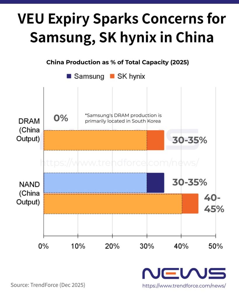 According to TrendForce, around 30–35% of Samsung’s total NAND output is expected to come from China in 2025. For SK hynix, roughly the same share of its DRAM output will come from China, while the country plays an even larger role in NAND production, projected to contribute 40–45% of its total NAND output that year.