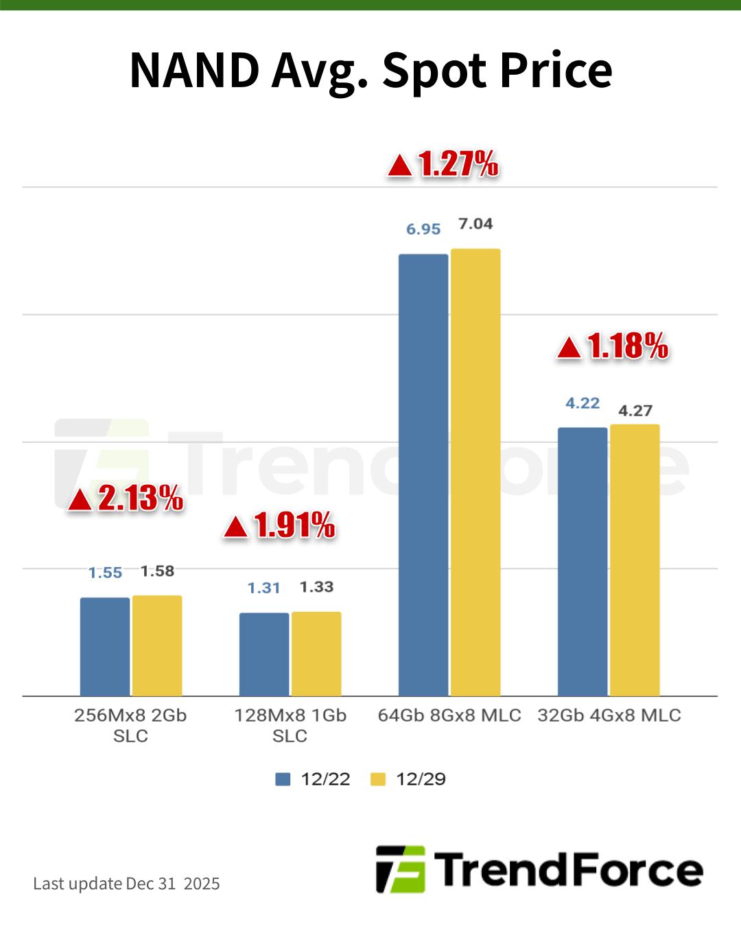 According to TrendForce’s latest memory spot price trend report, regarding DRAM, the price increase for DDR4 remains more significant compared to DDR5, and Samsung has clearly stated it will not defer its EOL plan. As a result, supply will decline rapidly for DDR4 in 2026, leading to the highest per-Gb price. Meanwhile, in NAND, spot prices have further risen under the expectation of increasing contract prices for 1Q26, though transaction remains limited. Details are as follows: