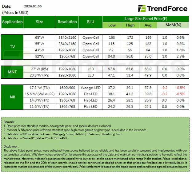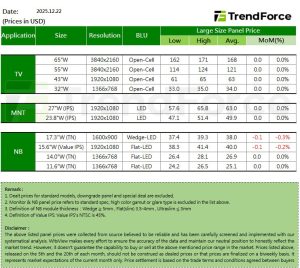 In January, LCD monitor panel demand remains in a seasonal low. However, with panel makers firmly maintaining price stability, mainstream panel prices continue to be supported despite weaker demand, and January prices are expected to remain broadly flat. From the first quarter onward, TV panel prices are set to enter an upcycle, which is expected to start stimulating LCD monitor panel demand. Combined with the impact of February production cuts, whether this will further drive LCD monitor panel prices to follow with price increases will be a key focus over the next one to two months.