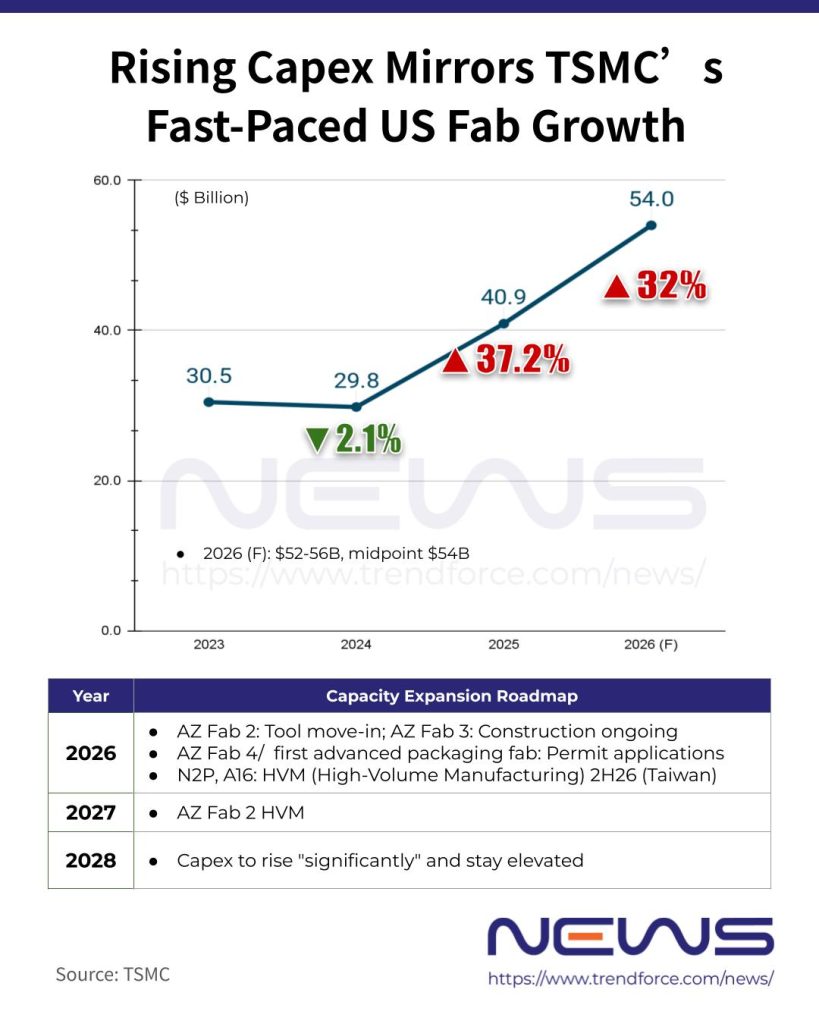 Notably, TSMC’s aggressive capital spending mirrors the fast-paced expansion of its Arizona production hub. During the 4Q25 earnings call, Chairman and CEO C.C. Wei highlighted the company’s recent US$197 million purchase of an additional land parcel in Arizona, signaling plans for multiple fabs to better serve U.S. customers.