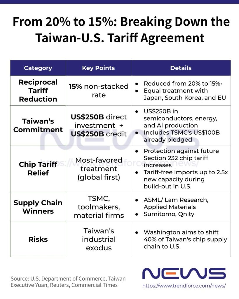 The concessions come with sizable commitments. In a fact sheet from U.S. Department of Commerce, Taiwanese companies are set to channel US$250 billion into boosting U.S. output across semiconductors, energy and artificial intelligence. Part of that total—US$100 billion—was already pledged by TSMC in 2025, with further investment expected, according to U.S. Commerce Secretary Howard Lutnick, cited by Reuters.