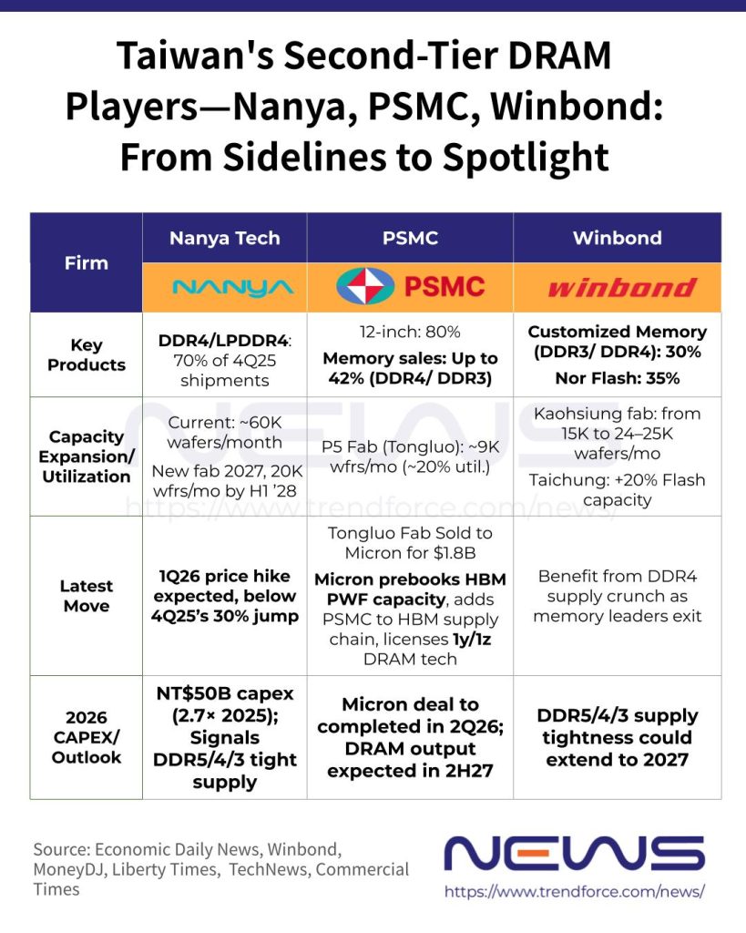 In addition, the Economic Daily News reports that Nanya Technology is investing aggressively, eyeing around NT$50 billion in CAPEX for 2026—2.7 times last year’s level. At today’s board meeting, the company confirmed its 2025 CAPEX cap of NT$19.6 billion, with actual spending at NT$13.4 billion and NT$6.2 billion deferred to 2026, the report adds.