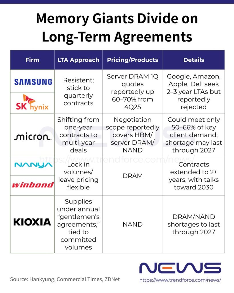 Far from embracing LTAs, Samsung and SK hynix have quoted first-quarter prices for key server DRAM customers that soar 60–70% above fourth-quarter levels, with similar hikes extended to PC and smartphone DRAM buyers, Hankyung reported in early January.