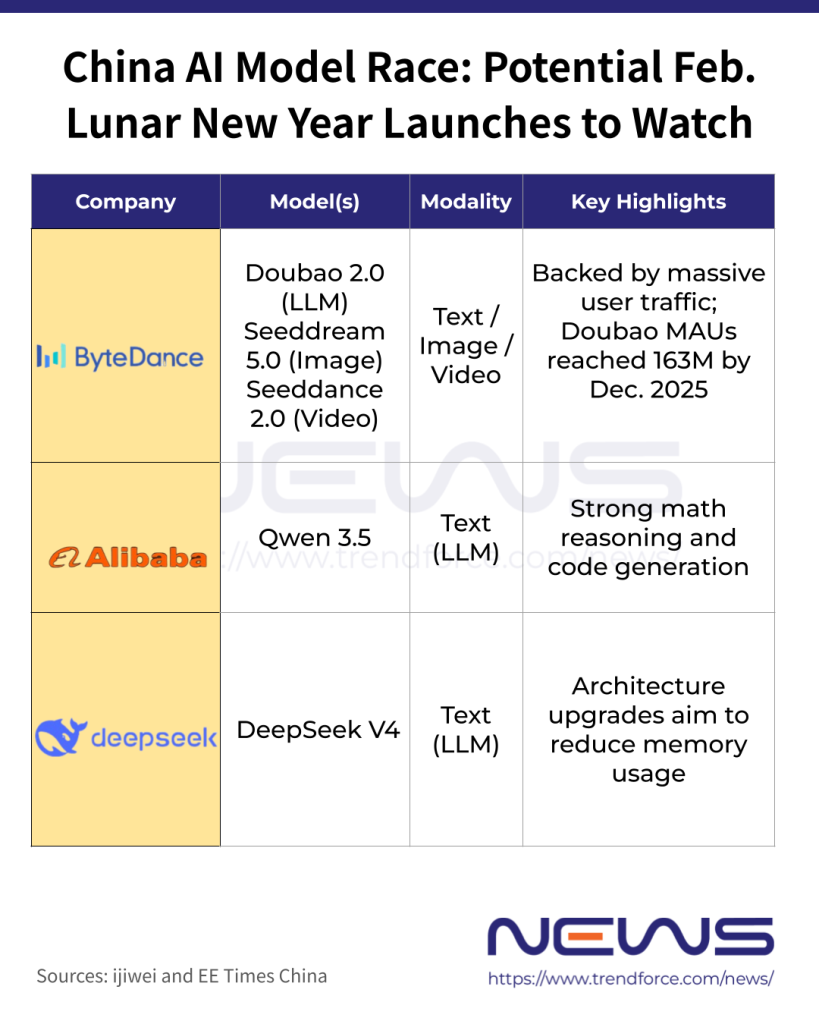 China is rumored to roll out new AI models during the Lunar New Year holiday in February. According to ijiwei, sources say that ByteDance and Alibaba are preparing to launch a new generation of flagship AI models around the period. Previously, EE Times China noted that recent updates to DeepSeek’s GitHub repository revealed a new architecture identifier, “MODEL1,” widely seen as the technical foundation for its next-generation flagship model, DeepSeek V4. Sources say the model could be released as early as mid-February 2026, further intensifying competition across the industry.