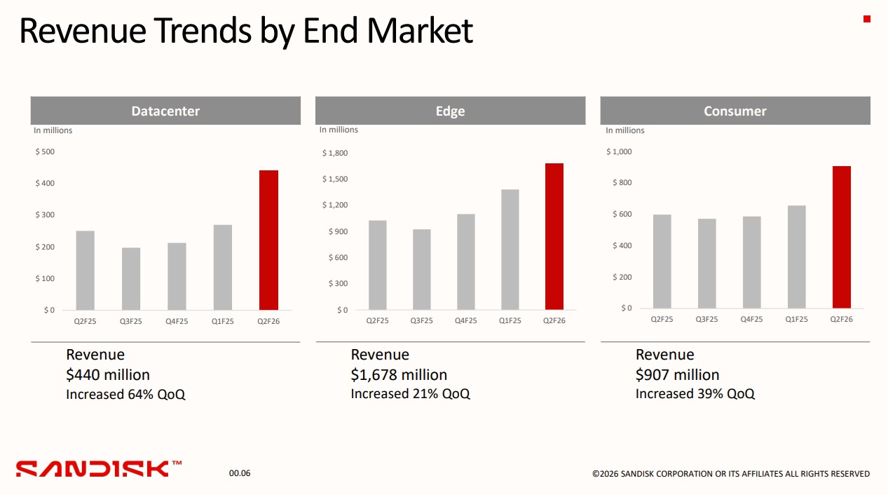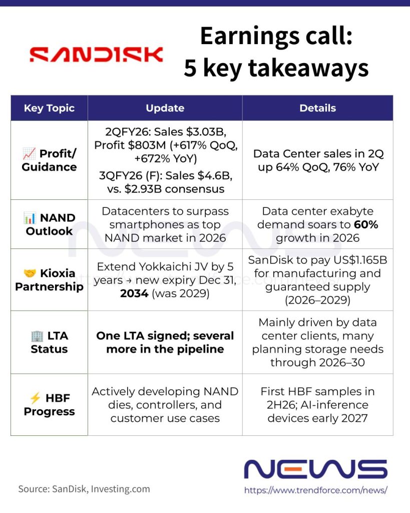 SanDisk reported net profit in 2QFY26 of US$803 million, up 617% QoQ and 672% YoY. By business segment, data center revenue reached US$440 million, up 64% from US$269 million in the prior quarter and 76% from US$250 million a year ago.