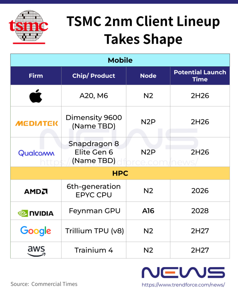 Commercial Times adds that from 2027, general-purpose GPUs and ASICs are set to ramp more broadly, including AMD’s MI-series GPUs, Google’s eighth-generation TPU, and AWS’s Trainium 4. As the report notes, industry sources expect TSMC’s 2nm family to become a node with a long lifecycle, with its initial ramp likely to exceed that of the 3nm generation. N2 is set to enter mass production in 2026, followed by the N2P and A16 in the second half of the year, with A16 targeting select HPC products requiring complex routing and high-density power delivery.