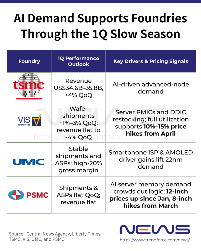 PSMC is also eyeing price hikes. As noted by Liberty Times, the company signaled upcoming increases during its investor conference last week, citing strong AI server–driven memory demand since January, which has partially crowded out logic capacity. As a result, wafer foundry prices for 12-inch display driver ICs (DDICs) and image sensors (CIS)—which were priced off a low base—have begun to rise since January, Liberty Times highlights. The report adds that power device demand tied to AI servers and edge computing—such as MOSFETs—has not only held up but increased, prompting PSMC to begin raising 8-inch wafer foundry prices from March.