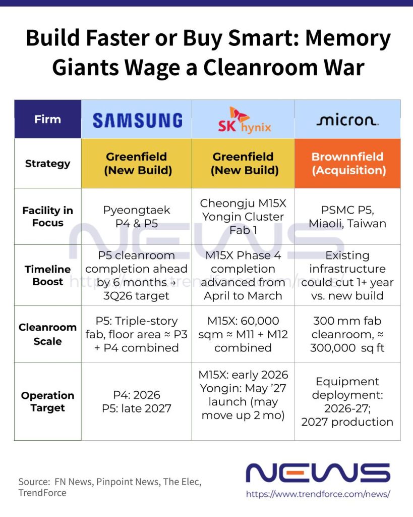 Amid soaring memory demand and aggressive product roadmaps from NVIDIA and other big techs, memory giants are racing not just on chip performance but also on cleanroom capacity, each taking a different approach. Financial News reports that Samsung and SK hynix are fast-tracking cleanroom construction to stay ahead, while Micron is pursuing a brownfield strategy, acquiring existing facilities to overcome constraints.