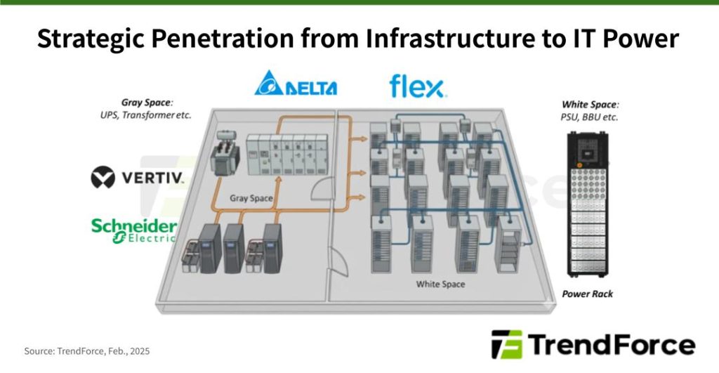 Looking at the current market landscape, only a limited number of suppliers possess the integrated capabilities to address both data center “gray space” infrastructure and “white space” computing environments. Leveraging its longstanding power electronics expertise and recent deployment of 800V HVDC solutions, Taiwan’s Delta Electronics holds a first-mover advantage in integrating gray and white space within data centers. Meanwhile, Flex has rapidly expanded its reach from critical power systems to the chip level through acquisitions such as Anord Mardix, Crown, and JetCool, building a competitive “grid-to-chip” pathway.