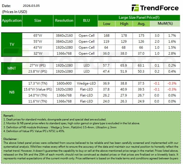 [Insights] Early March Panel Prices: TV Strength Continues; MNT Turns Up While NB Weakness Moderates
