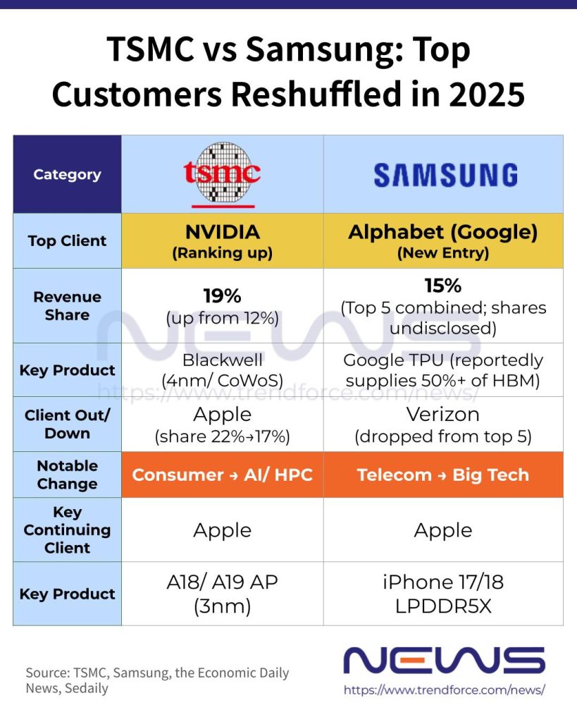 As NVIDIA reportedly overtook Apple to become TSMC’s largest customer, another chip giant—Samsung Electronics—also saw its key client lineup reshuffled in 2025. According to the company’s latest business report, cited by Korea JoongAng Daily and Sedaily, Google entered Samsung’s top five customers for the first time last year, replacing longtime core client Verizon.