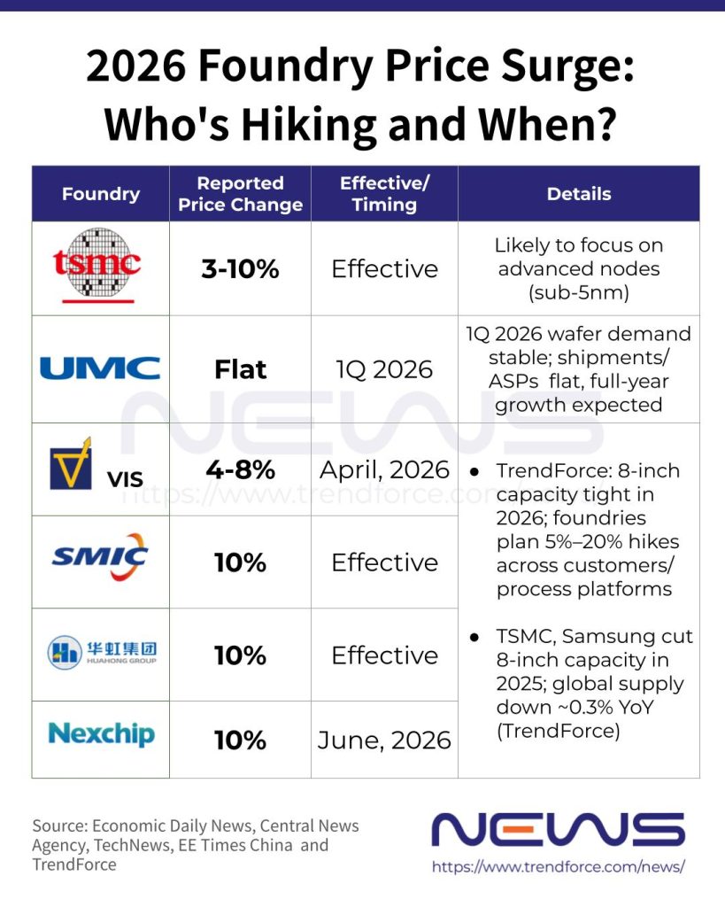On the other hand, TSMC affiliate Vanguard International Semiconductor, known for its focus on 8-inch fabs, could introduce price increases as early as the first quarter, with hikes estimated at around 4%–8%, according to Commercial Times.