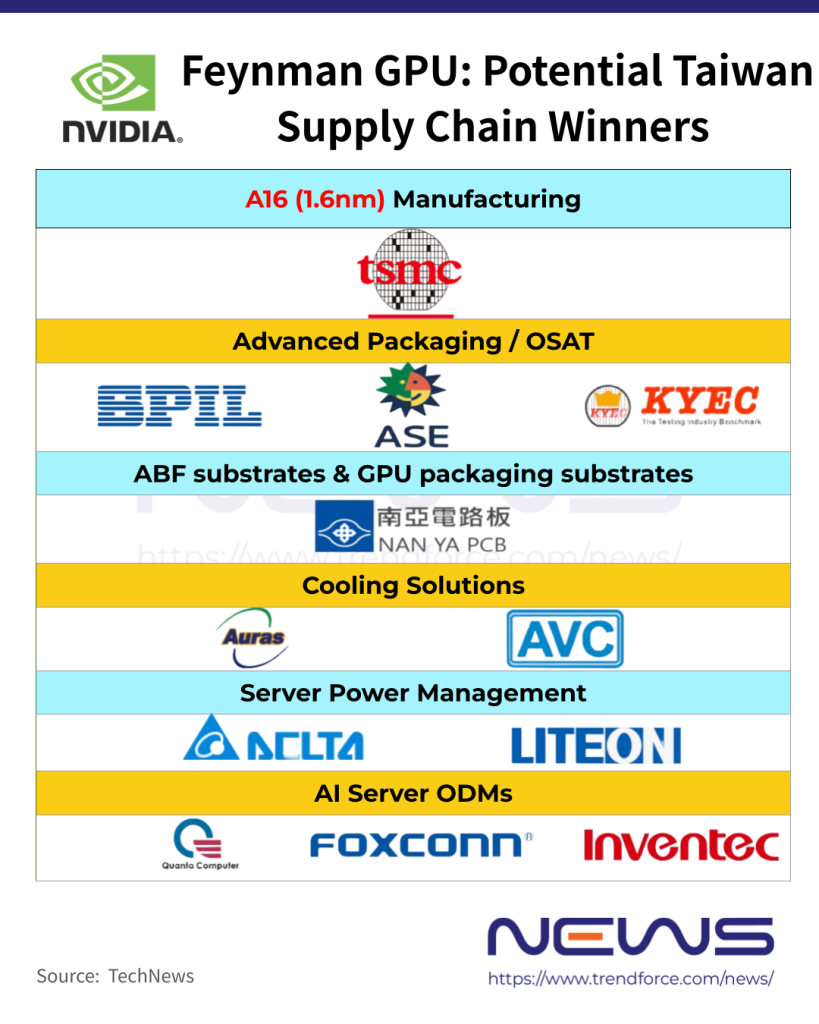 Beyond TSMC, Feynman is also expected to benefit other Taiwanese firms. As TechNews notes, the production of GPUs requires highly advanced packaging and testing technologies, driving strong growth across Taiwan’s OSAT supply chain. Major Taiwanese OSAT companies expected to benefit include ASE, SPIL, and KYEC. The report notes Taiwanese companies supplying ABF substrates and GPU packaging substrates, such as Nan Ya PCB, are also expected to see a surge in order demand.