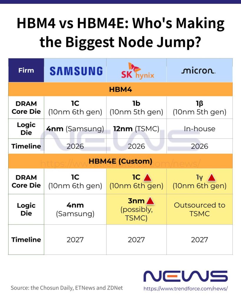 The Chosun Daily further notes that SK hynix is expected to adopt a 10nm-class 6th-generation (1c) DRAM process for the core die used in HBM4E, while applying TSMC’s 3nm to the logic die. For the HBM4 supplied to NVIDIA this year, the company reportedly uses a 10nm-class 5th-generation (1b) DRAM core die alongside a logic die based on TSMC’s 12nm. In contrast, Samsung has equipped its HBM4 with a 1c DRAM core die and a logic die built on 4nm.