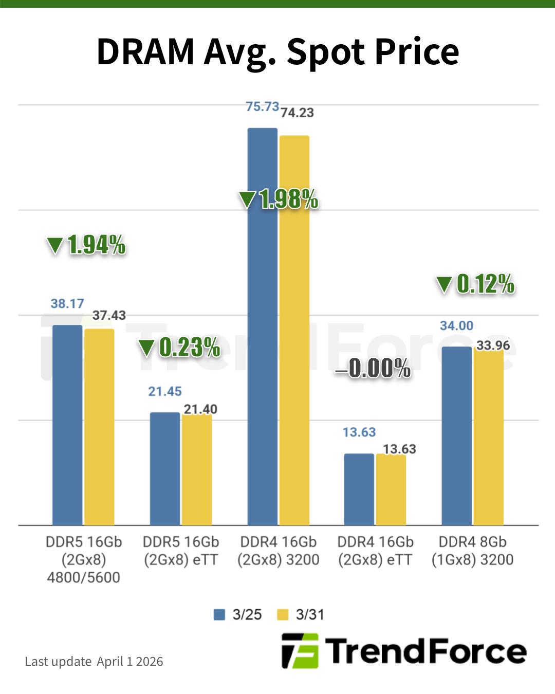 Meanwhile, chinastarmarket.cn reports on March 30 that prices for mainstream 16GB DDR5-5600/6000 modules on local e-commerce platforms have fallen from a peak of around RMB 1,300 in January–February to roughly RMB 1,000, representing a cumulative decline of 25%–30%.
