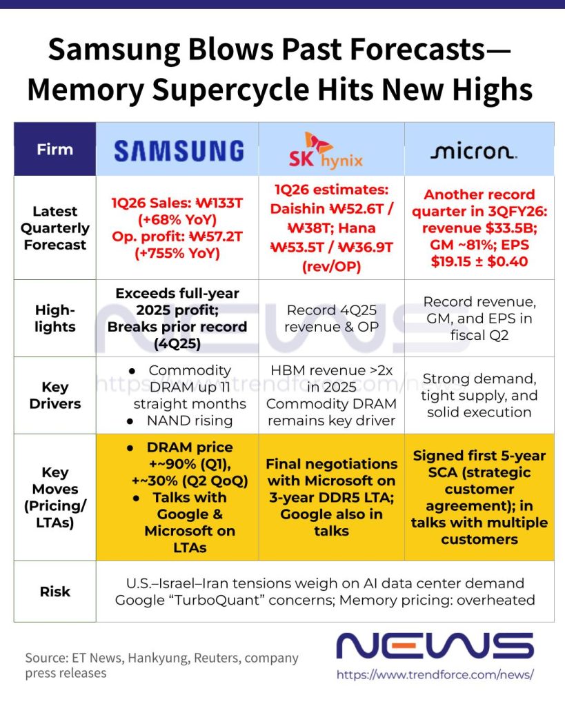 Amid a sharp memory price surge, Samsung is poised for a record-breaking first quarter, projecting that Q1 earnings will exceed its full-year profit from last year, as highlighted by Reuters. According to its April 7 press release, cited by the Chosun Daily, preliminary revenue soared 68% year-on-year to 133 trillion won, while operating profit jumped 755% to 57.2 trillion won.