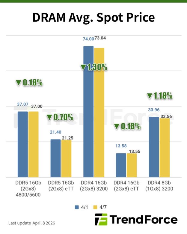 [Insights] Memory Spot Price Update: DRAM Extends Gradual Downtrend on Contained Selling Pressure; DDR4 Drops 1.18%