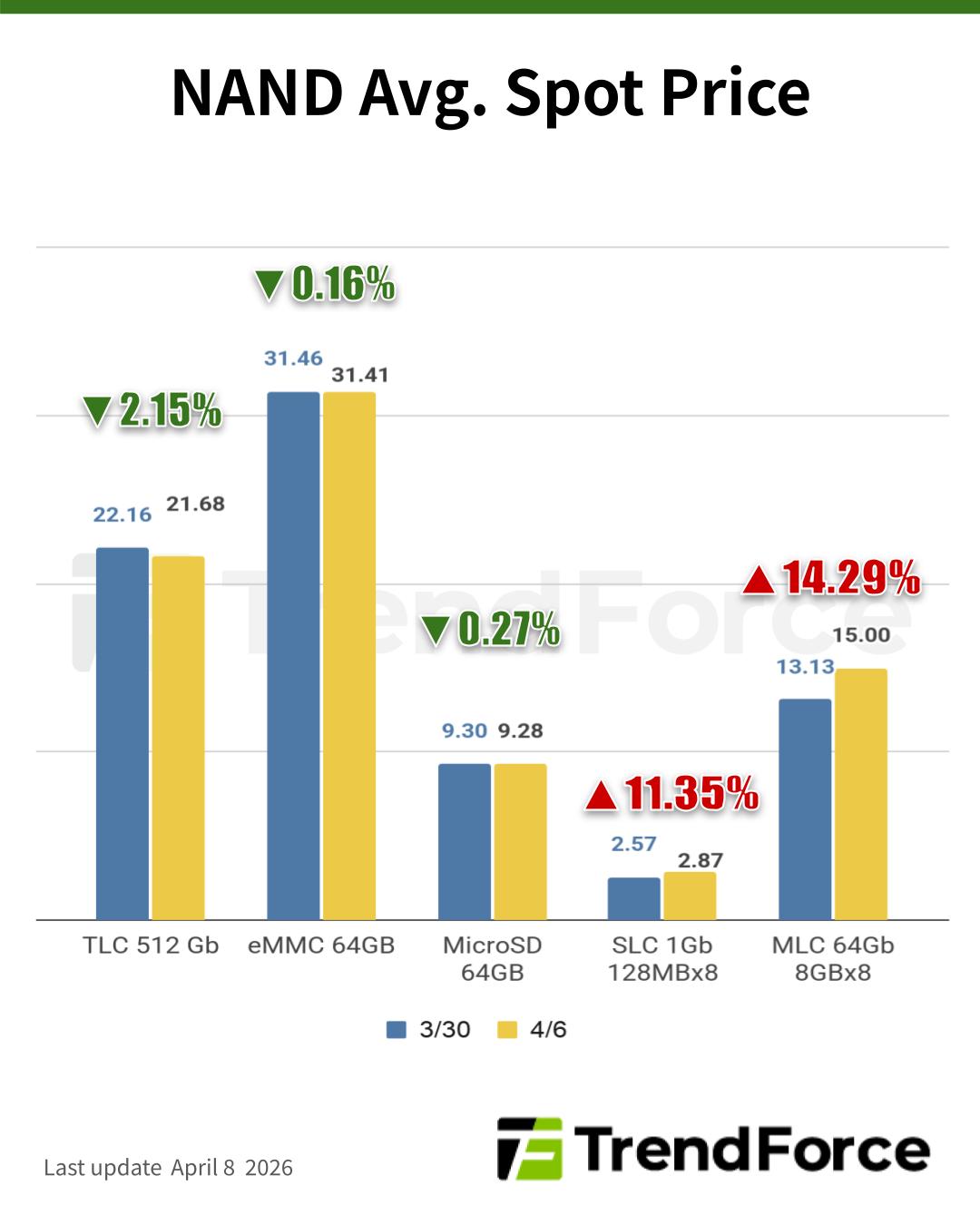 Consistent with the previous update, some spot traders have recently begun liquidating portions of their inventory to capture arbitrage opportunities and secure cash. However, selling pressure remains controlled, and spot prices continue to exhibit a gradual downward trend. The average spot price of the mainstream chips (i.e., DDR4 1Gx8 3200MT/s) slightly decreased by 1.18% from US$33.96 last week (4/1) to US$33.56 this week (4/7).