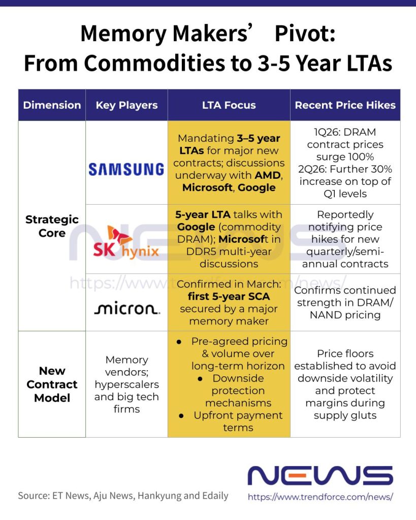 As memory emerges as a critical bottleneck in hyperscalers’ in-house AI chip development and large-scale infrastructure buildouts, long-term supply agreements are rapidly becoming the new industry standard—on time horizons longer than previously anticipated. According to Aju News, Samsung and SK hynix are moving away from one-year, short-term contracts with global big techs, transitioning instead to an LTA-only model spanning three to five years.