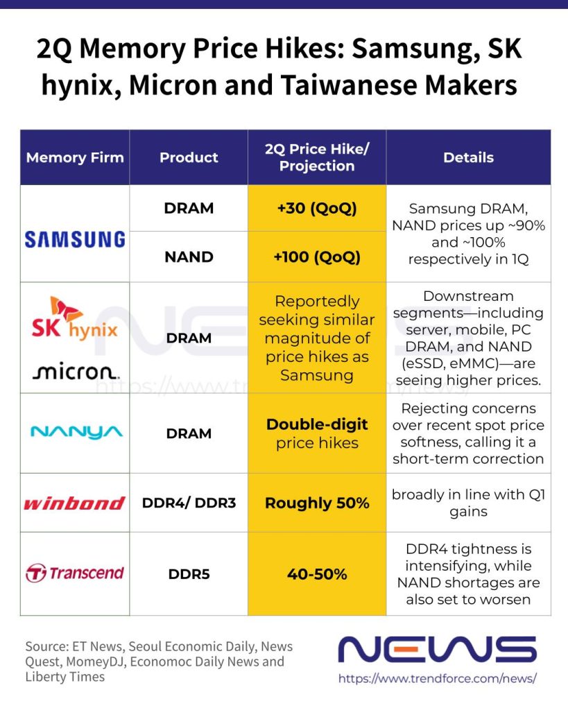 While Nanya Technology drew market attention with a $2.5 billion private placement backed by SanDisk, Kioxia, and Solidigm, the Taiwanese DRAM maker also posted strong results on April 13. Notably, Next Apple, citing General Manager Lee Pei-ying, reports that DRAM prices in the second quarter are expected to outperform the first, with double-digit gains.