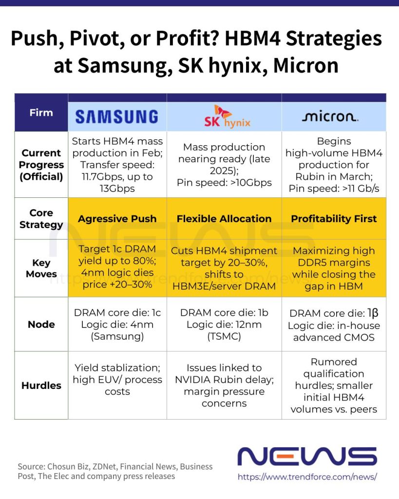 As memory giants enter the final stage of HBM4 ramp-up ahead of NVIDIA’s Rubin launch, they are taking diverging approaches. According to Chosun Biz, Samsung is pushing to lift 1c DRAM yields for HBM4 toward 80%, while ZDNet reports that SK hynix is set to cut HBM4 volumes this year by 20–30%.