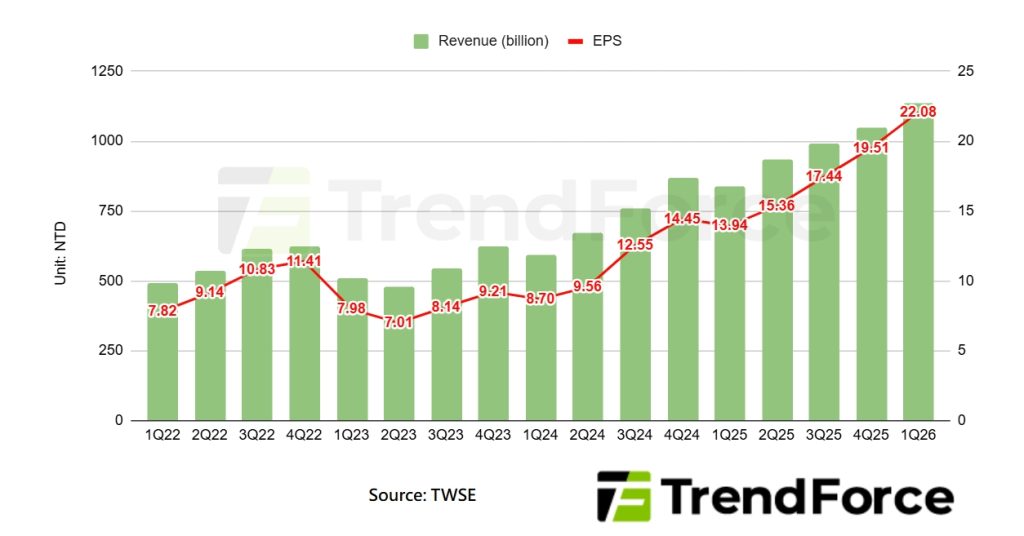 Notably, TSMC’s gross margin climbed to a record 62.3% in 4Q25, before setting another all-time high in 1Q26, surpassing the upper end of its 63%–65% guidance range.