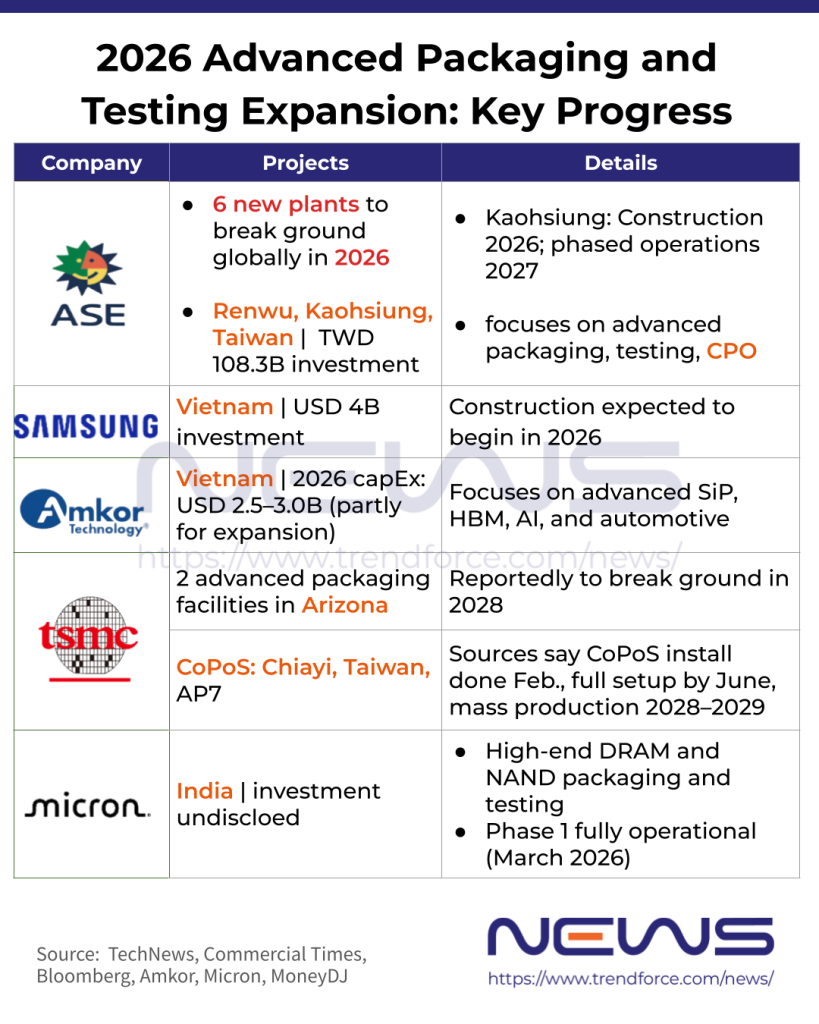 Since April 2026, global semiconductor packaging and testing sector has seen a wave of major developments. ASE has kicked off its largest-ever fab construction program, with six new facilities slated to break ground worldwide this year. Meanwhile, Samsung Electronics plans to invest USD 4 billion in a new packaging and testing plant in Vietnam, while Amkor is simultaneously accelerating its capacity expansion in the country.