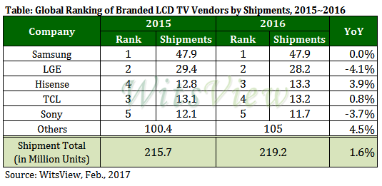 “Samsung posted flat annual growth for 2016 as it experienced shortages for mid-size panels through the year,” said Ricky Lin, research manager of WitsView. Samsung’s TV set shipments were especially affected by the earthquake in southern Taiwan last February and issues that its in-house supplier Samsung Display (SDC) had with the adoption of Black Column Spacer (BCS) technology.