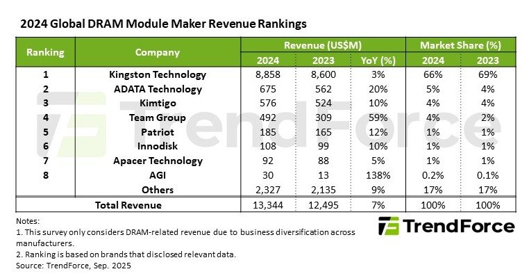In 2024, the leading five DRAM module manufacturers captured 81% of the total global revenue, with the top eight accounting for 83%. Kingston retained a strong 66% market share, maintaining its leading position. However, its revenue growth was slower compared to competitors, due to weaker demand in the consumer segment during the second half of 2024. Kingston remained focused on its high-end brand image, emphasizing profitability.