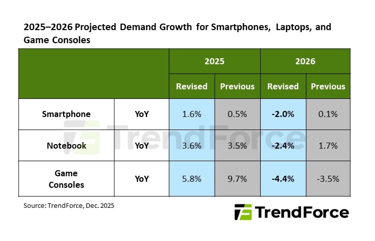 TrendForce’s latest report states that rising memory prices have significantly increased BOM costs in consumer electronics, leading brands to hike retail prices and dampening market demand. After reducing its 2026 shipment forecasts for smartphones and laptops earlier in November, TrendForce has also downgraded its 2026 forecast for game console shipments—from an initial YoY decline of 3.5% to 4.4%.