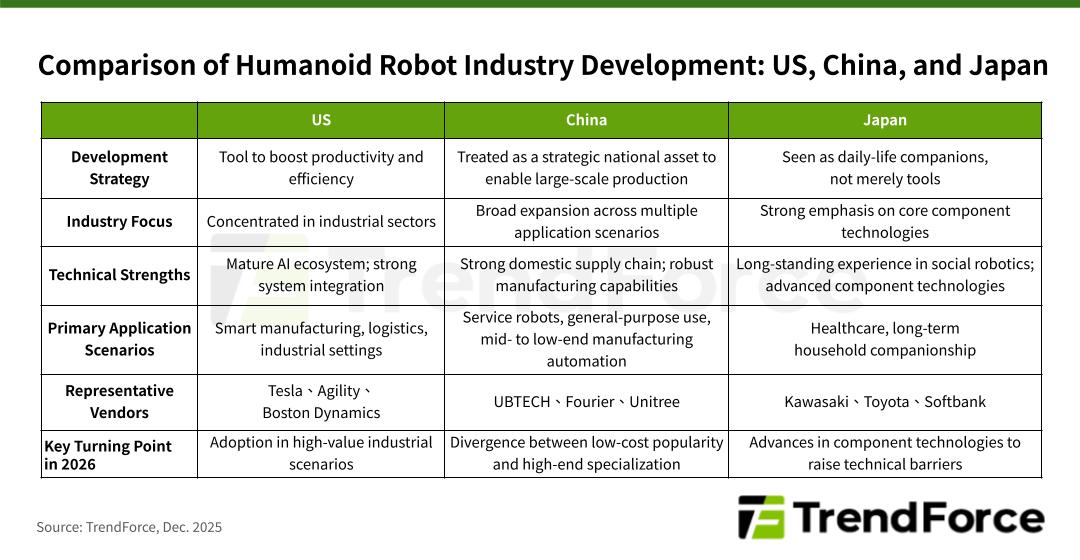 Major economies globally are advancing humanoid robot development. Japan is focusing on improving essential components like actuators, sensors, and control systems to increase the entry barrier. In contrast, the U.S. and China are rapidly rolling out end-to-end humanoid products. Since these regions focus on different application scenarios, their humanoid robot industries are likely to reach key turning points in 2026.