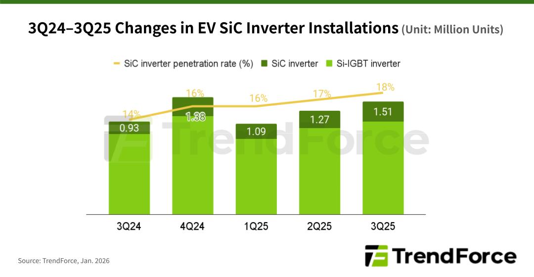 TrendForce highlights that SiC power semiconductors, due to their compact size and higher voltage capacity, are now crucial for advanced electric-drive systems. In 3Q25, worldwide SiC inverter installations reached a record high, surpassing 1.5 million units. The adoption rate in EVs rose from 14% in the same period of 2024 to 18%, and when focusing solely on NEVs, it reached 22%.
