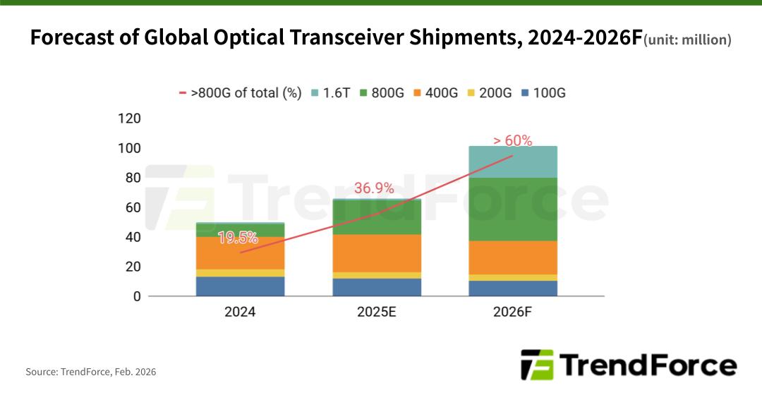 TrendForce estimates that the global shipment share of 800G and above optical transceiver modules will climb from 19.5% in 2024 to over 60% by 2026, positioning these modules to become standard components in AI-focused data centers.