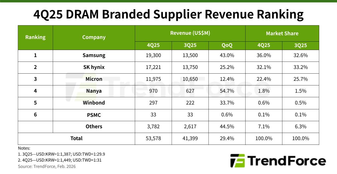 Samsung’s 4Q25 revenue climbed to $19.30 billion, up 43% QoQ, lifting its market share by 3.4 percentage points to 36%, allowing it to reclaim the top position. ASPs rose approximately 40% QoQ—the strongest among the top three vendors—while bit shipments grew in the low-single-digit range, supported by HBM business expansion and in line with company guidance.