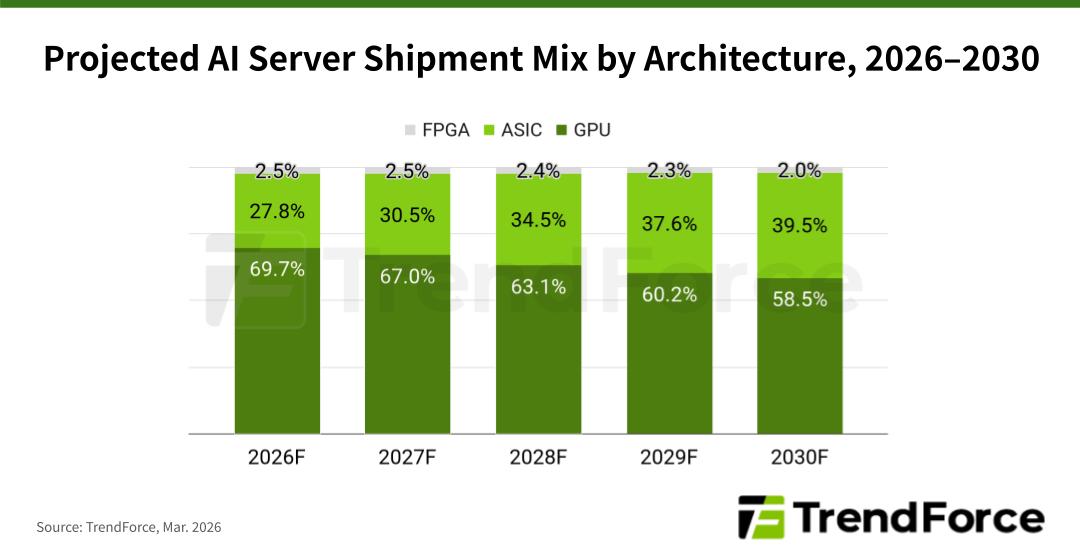 TrendForce reports that as CSPs like Google and Amazon increase their internal chip development, ASIC-based AI servers are forecast to represent 27.8% of all AI server shipments in 2026. This percentage is expected to grow to nearly 40% by 2030.