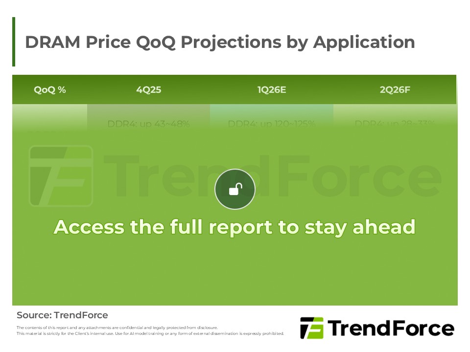- Following Samsung’s Aggressive Quotes, 4Q25 Server DRAM Contract Negotiations Will Conclude; Latest Revised Projection Puts Server DRAM’s Price Hike at 43-48%, Greatly Surpassing PC DRAM’s Price Hike