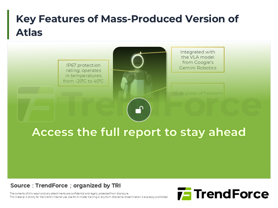 • Key Products and Their Specifications: Focus on representative product specifications and market features, such as Boston Dynamics Atlas 2026 ver., etc.